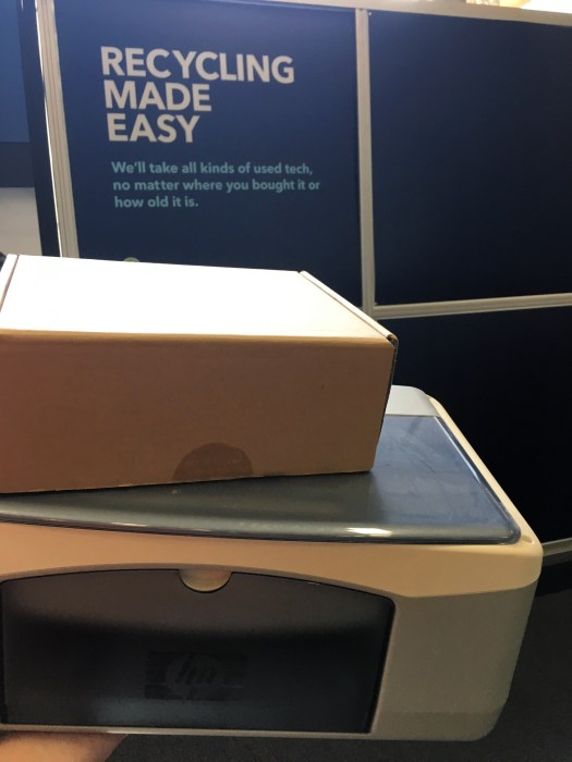 Also on my pile were some old electronics that needed recycling. My ten year old printer gave up the ghost earlier this year, and I’d already bought and installed its replacement. What I hadn’t yet done was take it to be recycled. Thank goodness for Best Buy, where I dropped off my electronics to recycle.