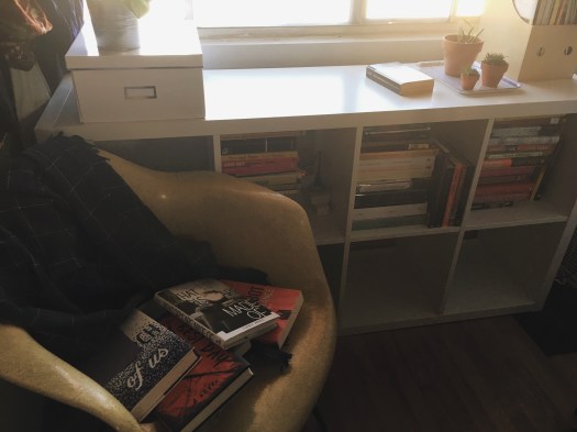I decided not to rearrange that much. Where the big pieces of furniture are makes sense to me in terms of size and flow, but I did make one big change. The table under the window that was ostensibly for eating, but was always covered in books, is gone. I gave it to my mom, and I’m glad to still have it around, albeit not in my little apartment. In its place is a bookshelf, a choice that makes all the sense. I got a Kallax from IKEA, which fits with both my budget and the Expedits I already have. It doesn’t hurt that it’s just the right height to fit under my window.